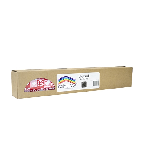 Rainbow Club Rolls are a 80gsm 500mm X 60m wrapping paper with a 38mm core. Each Rainbow Club Roll (except White colour) comes with its own dispenser box. Custom printing is also available.